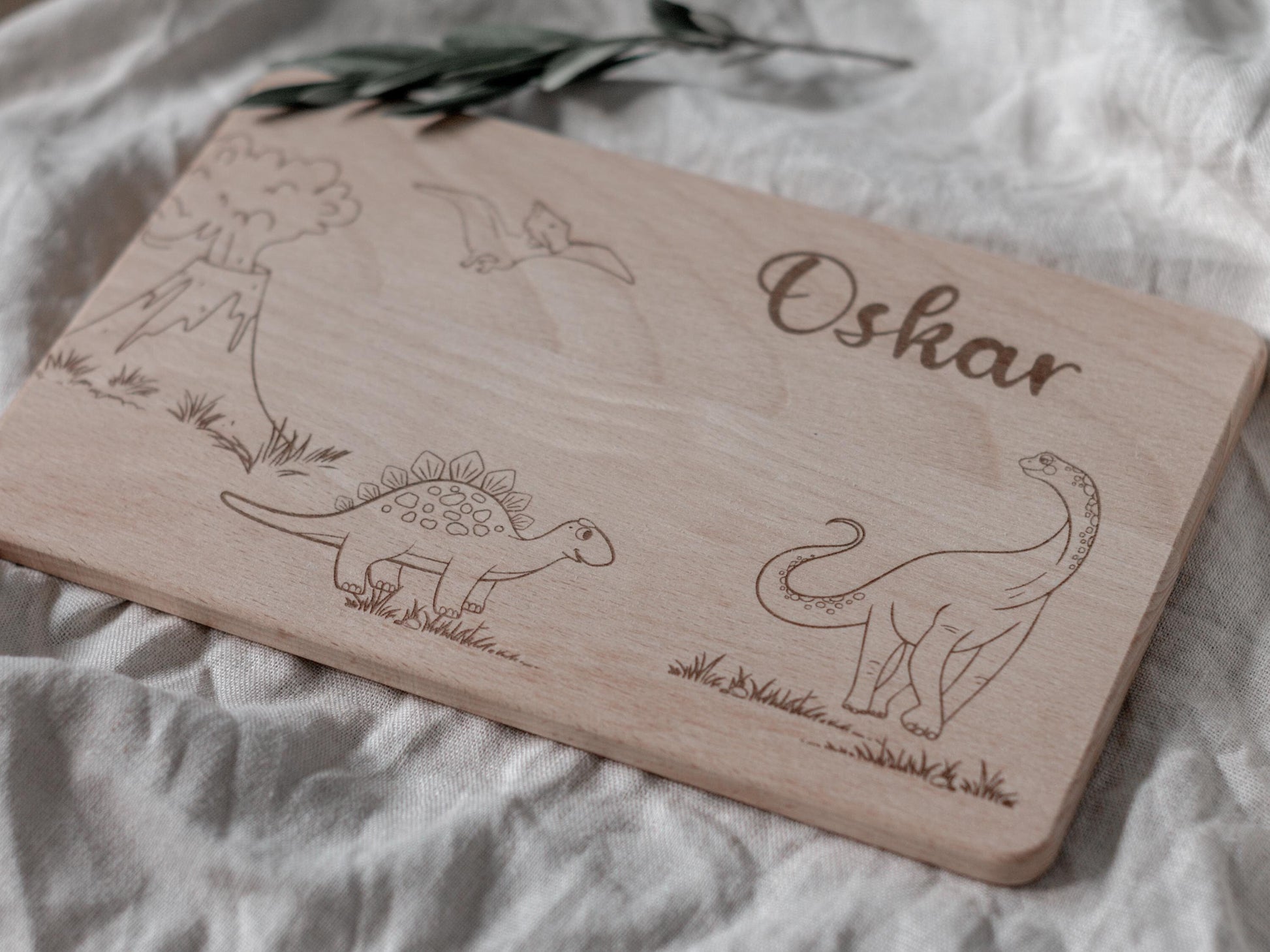 Bereite kleinen Dinosaurier-Fans beim Frühstück eine besondere Freude mit diesem personalisierten Dino-Brettchen aus Buchenholz!